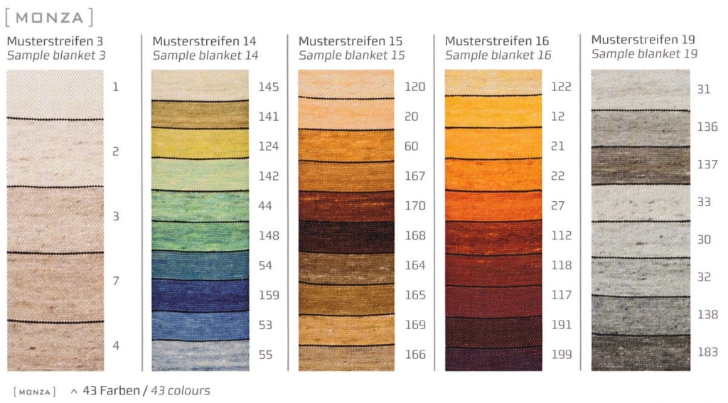 Die Inspiration für die Farben liefert Mutter Natur und das in Hülle und Fülle. Vom zarten Zitronengelb bis zum leuchtenden Goldorange des Sonnenuntergangs, vom funkelnden Rubinrot bis zum Braun des Ebenholzes, vom Pistaziengrün über das Türkis der Südsee, den Blaunuancen des Himmels bis hin zu allen Beigetönen weichen Strandsandes – die Monza-Design - Farbenwelt begeistert mit ihrer reichen Auswahl von 40 Farben! Die Farben der Dessins können ohne Aufpreis innerhalb der Monza Musterkarte getauscht werden.